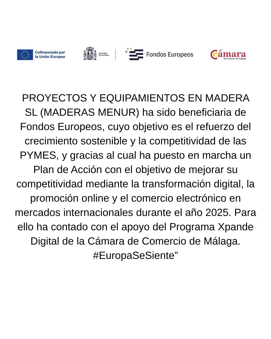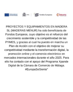PROYECTOS Y EQUIPAMIENTOS EN MADERA SL (MADERAS MENUR) ha sido beneficiaria de Fondos Europeos, cuyo objetivo es el refuerzo del crecimiento sostenible y la competitividad de las PYMES, y gracias al cual ha puesto en marcha un Plan de Acción con el objetivo de mejorar su competitividad mediante la transformación digital, la promoción online y el comercio electrónico en mercados internacionales durante el año 2025. Para ello ha contado con el apoyo del Programa Xpande Digital de la Cámara de Comercio de Málaga. #EuropaSeSiente”